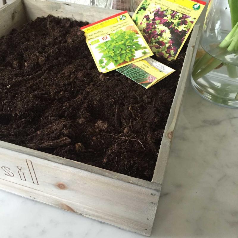 Dags att så! Klä en trälåda med stark ugnsfolie, ta rikligt med folie så att skarvar inte finns som kan släppa igenom väta. Fyll på såjord till strax ovanför foliekanten. Så och vattna! Ställ i ett ljust fönster. Du kan täcka lådan med plastfolie om du vill ha mer fart på fröna. När små skott visar sig mår sådden bra av att stå ute i värmen senare framåt försommaren. Snart kan du plantera ut skotten i mindre krukor.