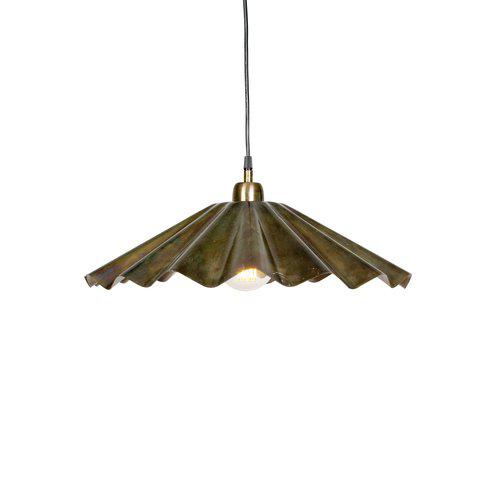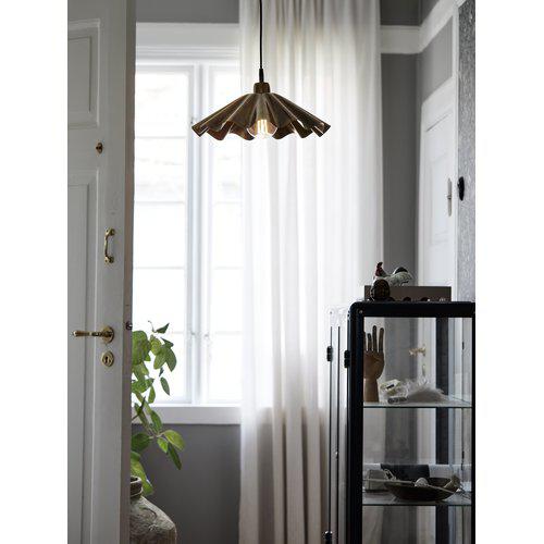 Taklampa Aira i oljemässingsfinish. En mindre pendellampa med organisk vågform i metall där den rustika stilen kombineras med en modern design. Finishen är handgjord och unik för varje möbel. Oljemässingsfinishen ger ett varmt ljussken. Höjd 21 cm och diameter 49 cm. 1,6 m svart plastsladd med takkopp för krokupphängning. E27-sockel. Max 25W. IP20. Kontakt och ljuskälla ingår ej.