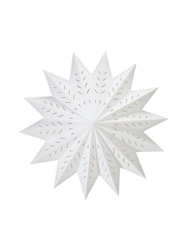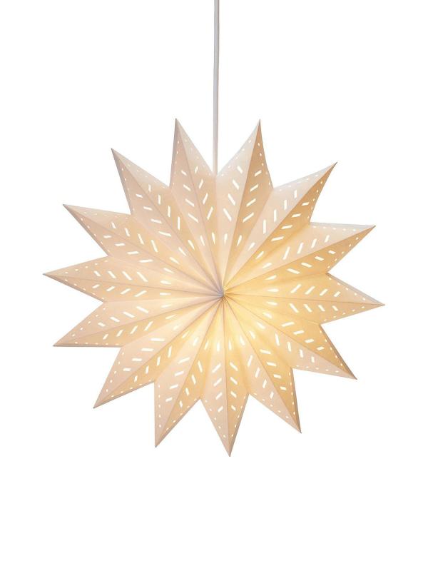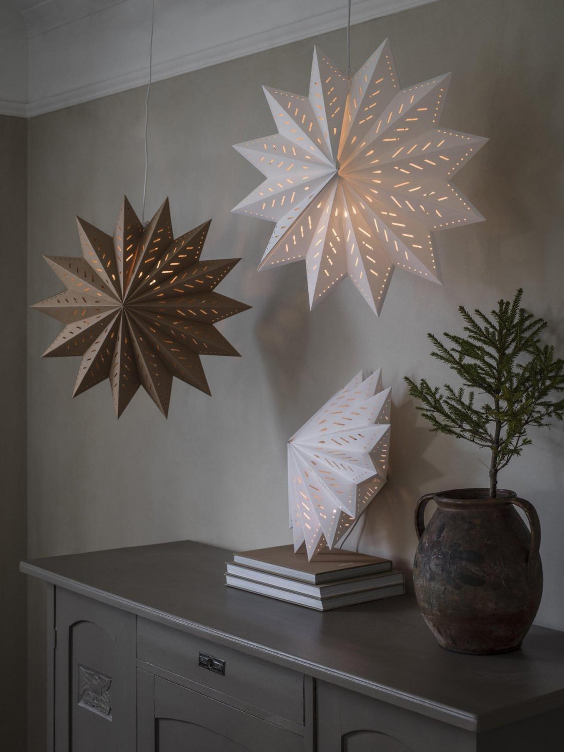 Julstjärna i papper av något kraftigare kvalitet med stansade hål som filtrerar ljuset på ett vackert sätt. Försluts med snöre och propp. Lägg till E14-sladdstativ och ljuskälla, max 25W. Höjd 50 cm, bredd 50 cm och djup 30 cm.