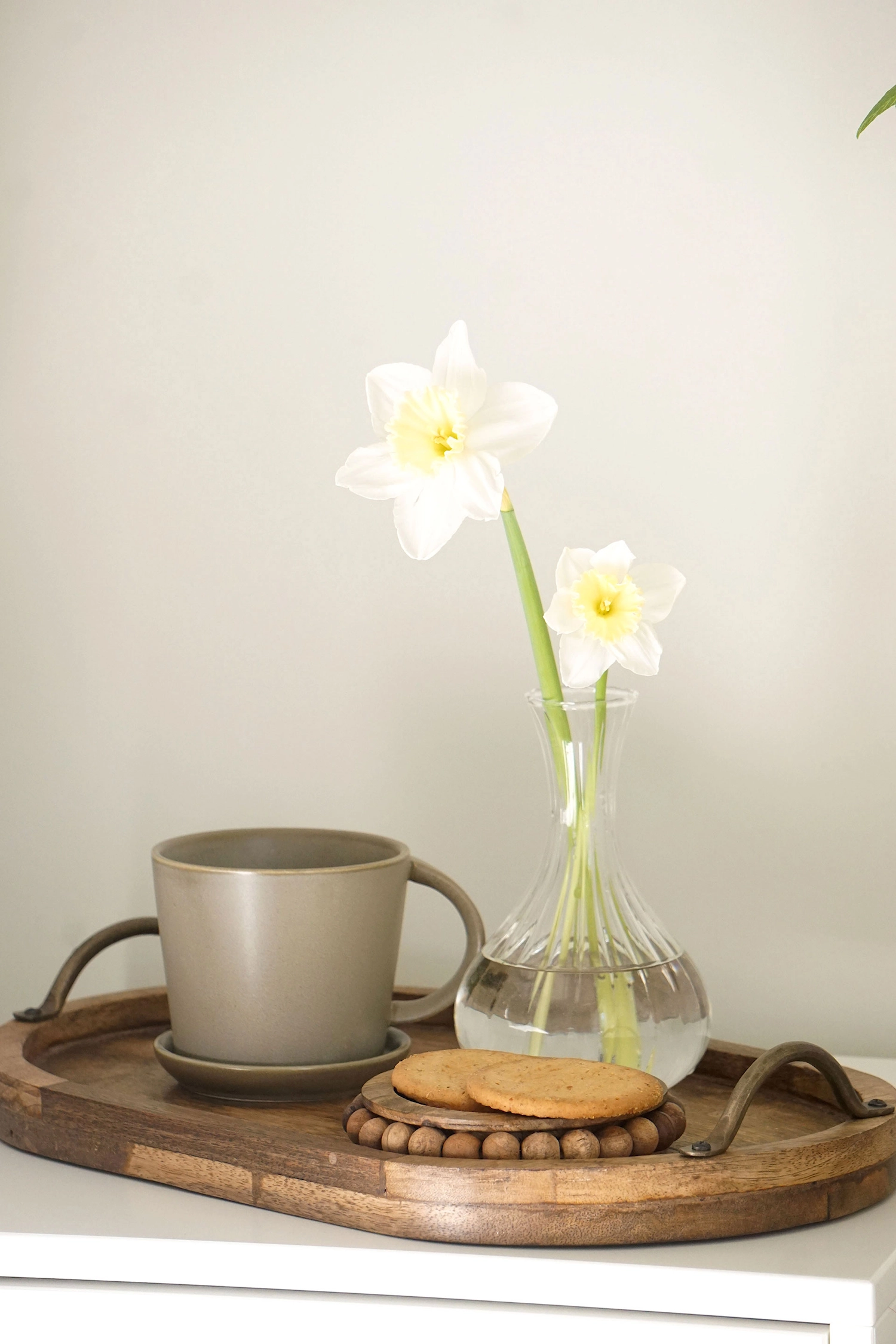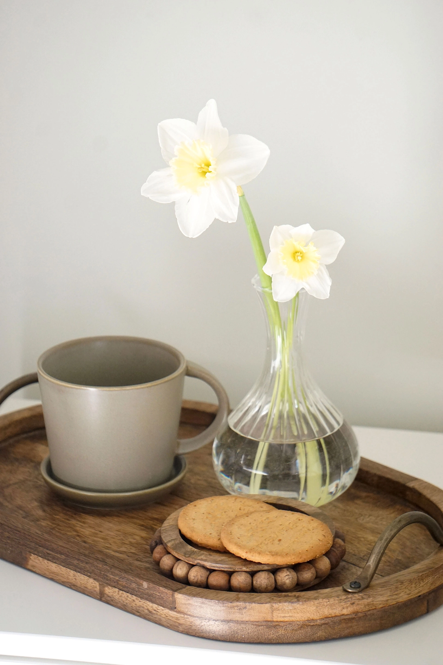 Bär med dig frukost eller eftermiddagsfika på denna fina träbricka med handtag. Tillverkad i mangoträ och metall.