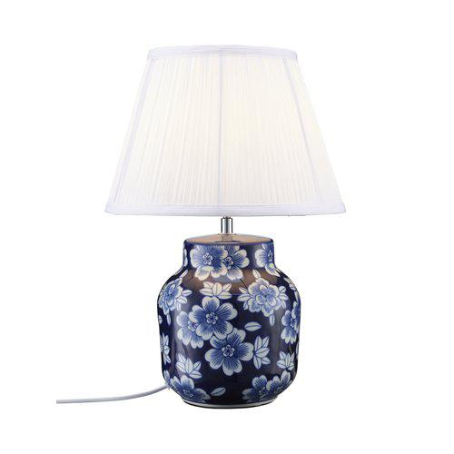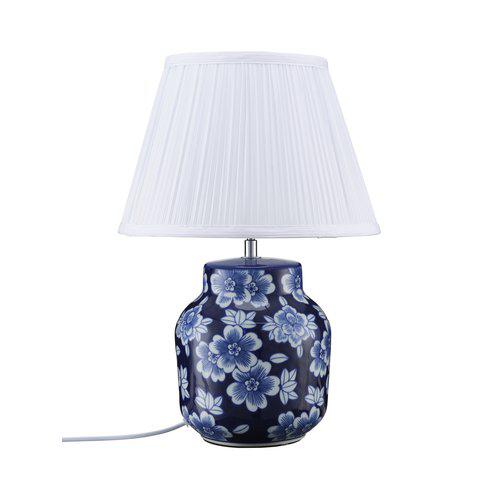 Fanny bordslampa i glaserad keramik med ett detaljerat blommönster i blå och vita toner komplett med en vit veckad tygskärm. Designen är klassisk och tidlöst elegant. Bordslampan både lyser upp och blir en fin inredningsdetalj. Totalhöjd 47 cm. Skärmdiameter 32 cm och höjd 21 cm. Lampfotens diameter 19 cm, höjd 31 cm. E27 lamphållare, max 40W. Lamphuvudet är ledat för horisontell justering av skärmen. IP20 för inomhusbruk. 1,7 m vit sladd med strömbrytare och platt EU-kontakt. Ljuskälla ingår ej.