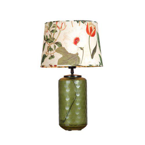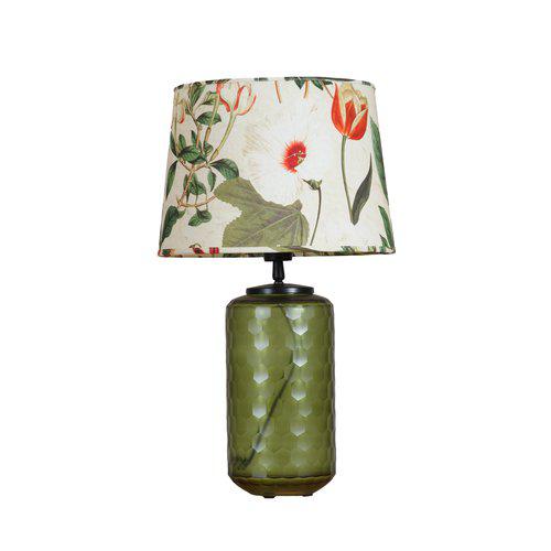 Gabby-lampa i munblåst grönt glas med matchande lampskärm. Den djupgröna färgen i kombination med det djärva mönstret skapar ett vackert ljusspel i rummet. Metalldetaljer i mattsvart och en 2 meter lång svart sladd med strömbrytare. E27-sockel, max 40W. Sofia-lampskärm i mönstrat bomullstyg. Skärmen ger ett mjukt sken och kan kombineras med många olika lampfötter. E27-ringfattning. E27-glödlampa säljs separat.