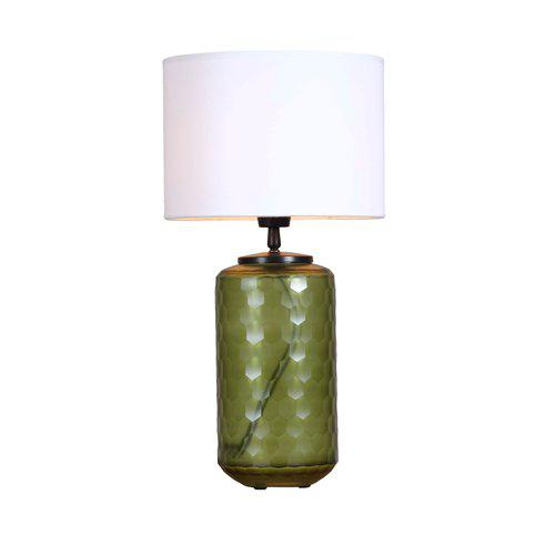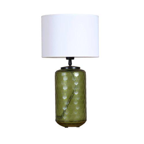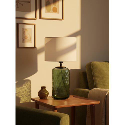 Gabby-lampa i munblåst grönt glas med matchande lampskärm. Den djupgröna färgen i kombination med det djärva mönstret skapar ett vackert ljusspel.