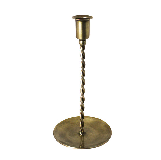 Låg ljusstake för kronljus i antik mässing . Den vackra patinan och de åldrade detaljerna gör att den passar fint in i lantliga, klassiska och rustika