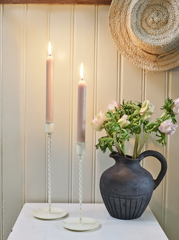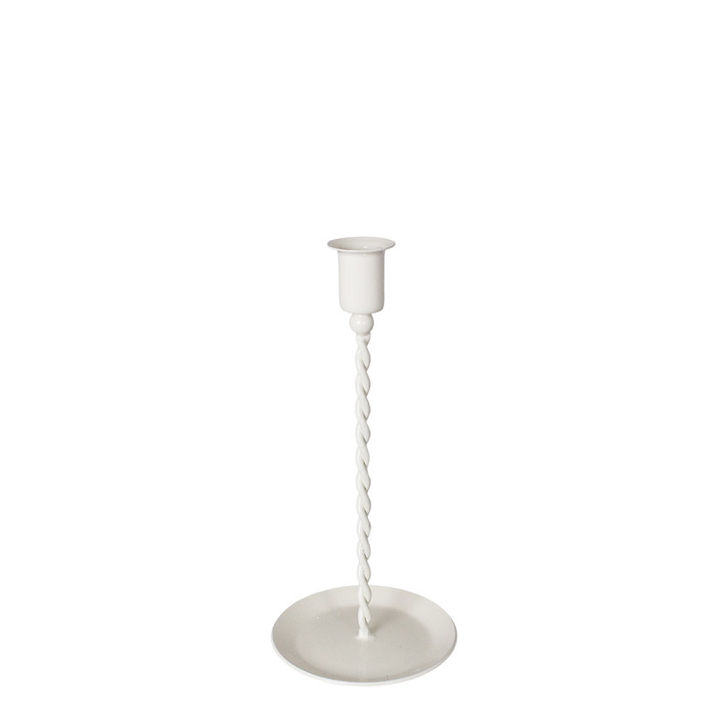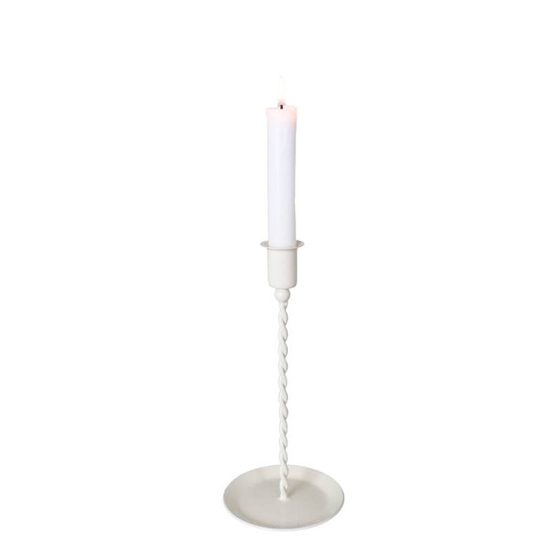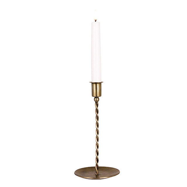 Låg ljusstake för kronljus i antik mässing eller vit. Den vackra patinan och de åldrade detaljerna gör att den passar fint in i lantliga, klassiska och rustika hem. Placera ljusstaken på ett sidobord, en byrå eller mitt på middagsbordet ihop med fler ljusstakar i olika höjder, för att skapa en förtrollande atmosfär under kvällens middagar eller speciella tillfällen.