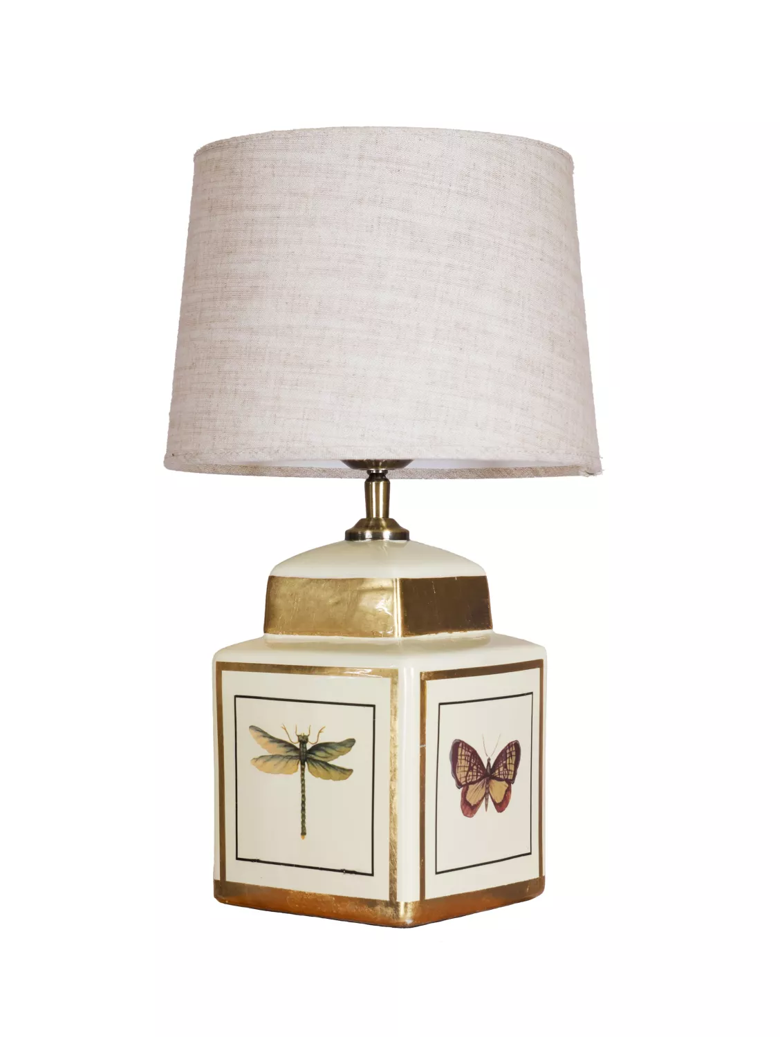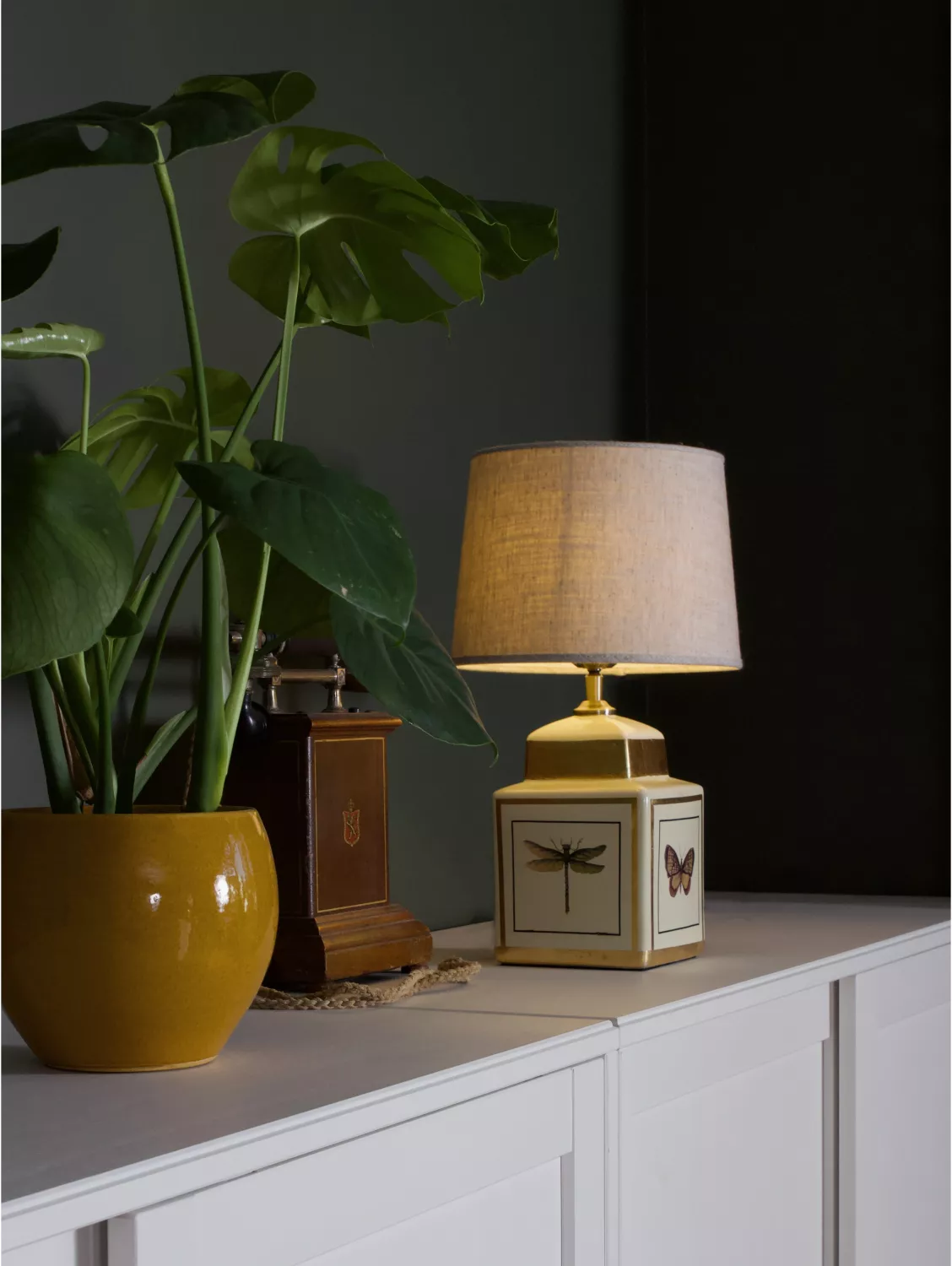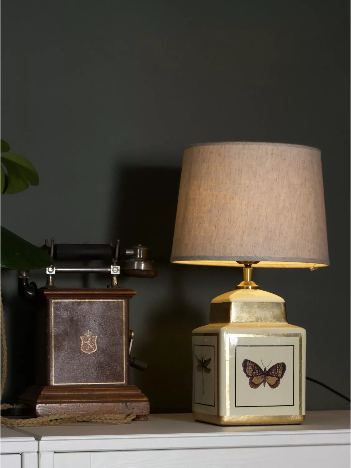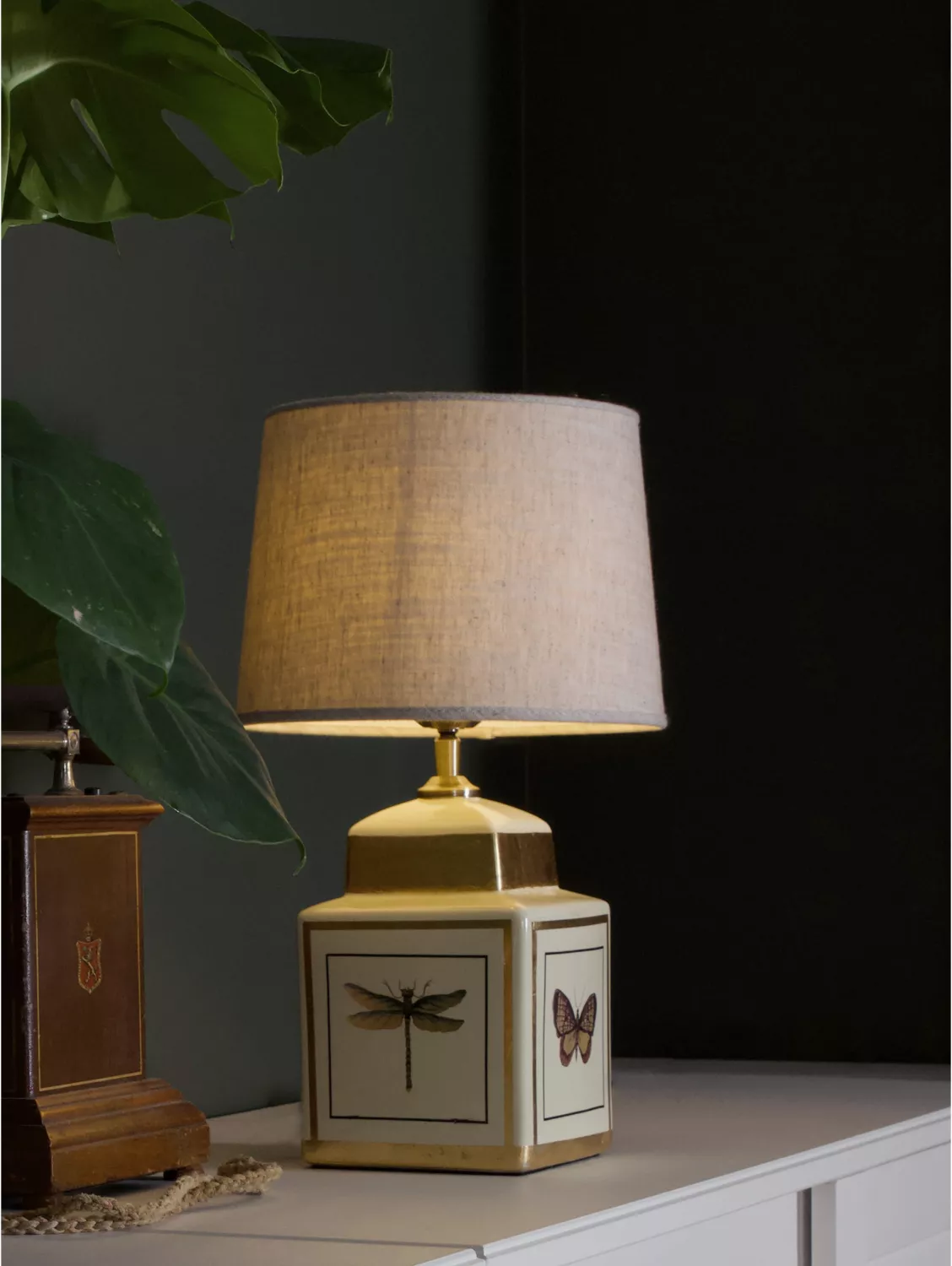 En keramisk bas i en mjuk gul nyans, prydd med handmålade pastellfärgade fjärilar och skimrande guldaccenter. Dess fyrkantiga siluett ger lampan ett rent, strukturerat utseende, medan de delikata färgerna och motiven tillför värme och lekfullhet. En raffinerad blandning av design och personlighet som passar perfekt på ett nattduksbord, fönsterbräda eller läshörna. Med en höjd på 45 cm och en skärm på 25 cm i diameter erbjuder lampan en kompakt, lättplacerad storlek som inte kompromissar med stilen. Den har en E27-sockel (max 40W) och levereras med en 180 cm lång svart textilsladd med EU-kontakt. Strömbrytaren är placerad 50 cm från basen för enkel åtkomst. Ljuskälla säljs separat. En liten lampa med en djärv närvaro – perfekt för att ge en touch av charm och individualitet till alla utrymmen.