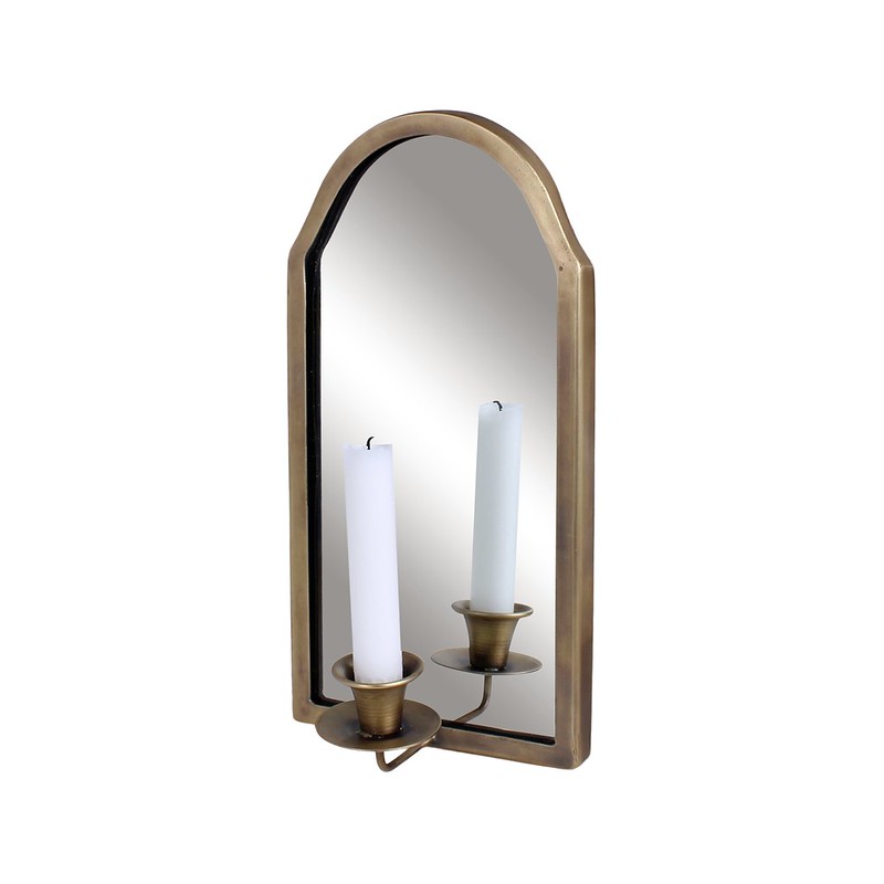 Vacker väggljusstake i antik mässing med spegel för ett kronljus. Spegeln reflekterar ljusets låga och skapar ett magnifikt ljusspel. Spegellampett som passar i de flesta rum då den är stilren.