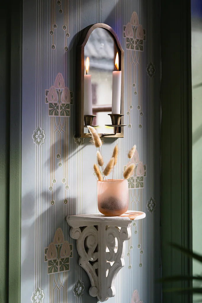 Vacker väggljusstake i antik mässing med spegel för ett kronljus.